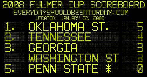 The first scoreboard update for the Fulmer Cup begins with classic material and new developments. First, the scoreboard, brought to you as always by Brian, who is hung like Reggie Fucking Nelson: