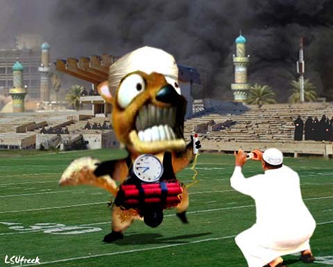 After bouncing around our brain for a few caffeine-addled hours, the meaning became all too clear: Twitchy is an imaginary mascot, the meaning and spirit of something embodied in a cartoonish, anthropomorphic form. Thus, we present to you our first imaginary mascot, Twitchy the Martyr, the mascot for Jihad A&M University. Lovingly by LSUFreek with some degree of homage to Hoodwinked.