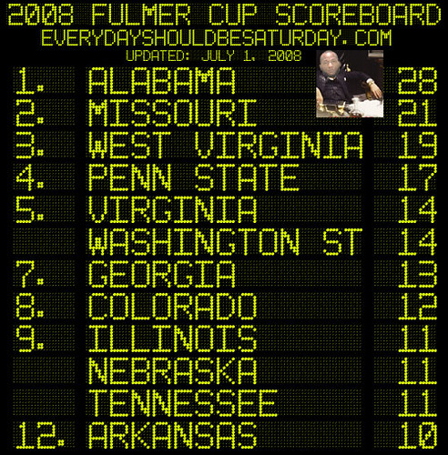 You see, initially it was just going to be a simple DWI for Arkansas, the kind of crime we like to refer to as a "summer classic" here in the Fulmer Cup Season. Freddy Burton, 19, a linebacker for the Razorbacks, goes off and blows a .13 after being pulled over by local cops, earning Arkansas a quick three points, and then we're out, and Brian doesn't have to redo the board, and we can go back to shooting rocket launchers at imaginary airplanes in Liberty City in between mugging prostitutes and launching ourselves off overpasses. In other words, doing what we do best in the month of July.
