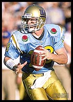 We know one lucky soul who remembers UCLA at all times, though: Mack Brown.(Click here for a magnificently captioned photo of the current Texas coach.) Brown owes his break into The Big Job at Texas to UCLA and the results of the biggest regular season blowout between two major college football powers in memory: the 66-3 annihilation of Texas by UCLA in Darrell Royal stadium. The Longhorns turned the ball over...(sound of throat clearing)...eight times in the course of making Cade McNown look like the next coming of Football Jesus. We remember watching the game-Mackovic on the sidelines had the ashen look of a stroke victim. We want to type something funny here, but we just can't; Mackovic looked like the guy in Indiana Jones and the Last Crusade who drinks from the wrong Holy Grail and ages a thousand years in an instant. Watching Cade McNown float the ball downfield at will, we could almost hear the voice: "He chose...poorly."
