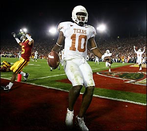 Do you think the Longhorns watched all month as ESPN performed constant fellatio on the USC Trojans 2005 team? Did the feel just a bit disrespected that the worldwide leader spent far less time talking about the Rose Bowl matchup than they did mythically pitting USC’s second best team in the last 2 years against historically great teams, only to find that noone could stop these Trojans? Perhaps Vince Young felt a little miffed when ESPN decided it would be the number campaigner for Reggie Bush’s Heisman run. Well, Texas got the last word and it was a resounding one. Although Reggie Bush might make for a better pro prospect, Vince Young proved he was the best college player in the country last night. It was clear and unequivocal. Texas had to stop a myriad of USC future first rounders yet they were able to contain Bush save for one big play. USC had only to watch for one playmaker but Young was simply too good. Take that Bristol University!
