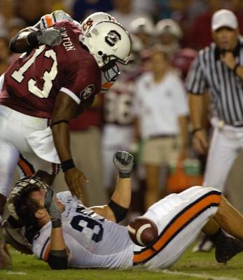 This nearly happened as South Carolina almost beat Auburn 24-17, with only a clanking pair of traitorous hands keeping the Gamecocks from tying it up in the dying last seconds of the game. Brandon Cox was forced to convert 4th and 6 and 3rd and 21 in the third quarter to hold possession. The buzz line is that Auburn held the ball for the entire third quarter--astonishing, especially since Tuberville engineered the cock-free third quarter by going for an onside kick to get the ball back and eke out another Irons rushing touchdown.