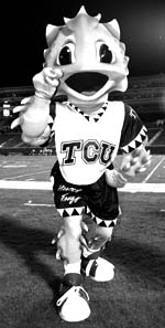 We'd spent the previous half hour killing time in the office of associate athletic director Scott Kull, who'd made several important points about the school's distinctive mascot. "The horned frog -- actually a spiny lizard -- subsists on a diet of red ants." It had long been believed that this creature was capable, when angered or frightened, of directing a four-foot stream of blood from its eyes. Kull tells me that's not blood, but rather, pre-digested red ants.
