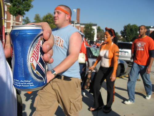 They also cook with Weber grills, a true sign of outdoor craftsmanship. In the clip below, we tell another man that he has a fine piece of meat and drink coffee at a tailgate without getting our ass cut off, grilled, and handed back to us on a styrofoam plate--strong evidence of a very pleasant and tolerant fanbase. By the way, the woman did give us a Miller Lite in a can, featured prominently in the photos follwing the jump, which we were forced to double-fist along with the venti Starbucks we had in hand.