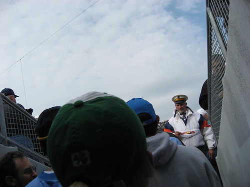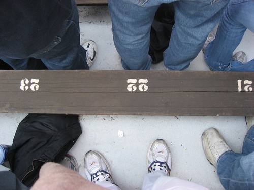 Unfinished, splintery, and creaky old wooden planks make up the lower rung of seating, with numbers stenciled on in military font spaced just far enough to allow for the squeezing of cheeks clearly not fed daily on a diet of high-fructose corn syrup. You want Knute Rockne’s benches? Well, there they are, brown and unforgiving. It’s a no-frills, crystallized vision of antediluvian game-watching that is a bit jarring to those accustomed to videologue game intros and WOO-HOO! FIREWORKS to start the game, but after a few minutes it’s hard not to feel a sudden fondness for leather helmets, the flying wedge, and players with long, unpronounceable Slavic names.