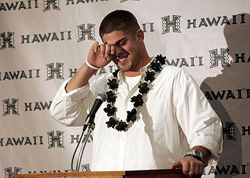 --Colt Brennan elects to spend one more year as a single young man playing quarterback in the country's most pass-friendly attack in one of the most stunning natural environments known to man. Brennan made his announcement wearing a lei and surrounded by callipygous but toned young women in bikinis who played with his hair and fed him smoked mahi-mahi by hand during the announcement. Why he did this rather than potentially playing for the Cleveland Browns is a matter of conjecture we'll leave to science.