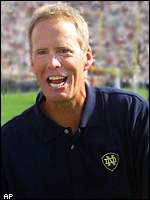 --Speaking in the key of race-baiting: sportswriters may rejoice that Charlie Weis is still white and Ty Willingham remains black, since it's great fodder for filler columns. And in same article, see Bob Davie, announcer! Aficionado of ze camel hair jacket! Possessor of an unusually shaped cranium! And lastly, partisan ex-employee par excellance: