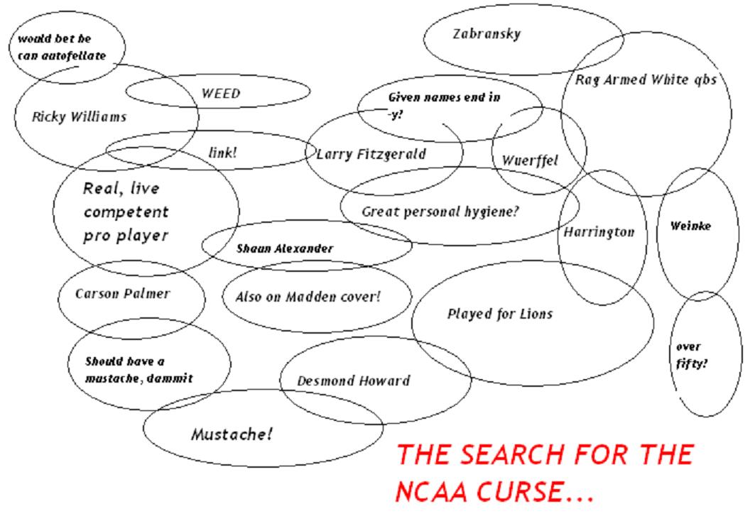 Following last week's announcement of Jared Zabransky as the NCAA cover boy for this year, we went to work trying to parse out the single thread cursing all NCAA cover dwellers. Unlike the famed Madden Curse, however, no single diabolical streak of malicious fortune unites all of the anointed NCAA cover guys. Believe us: we graphed it out.