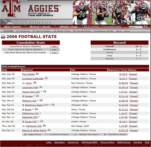Thanks to eagle-eyed tipster Dave, we may now proudly report that the Texas A&M Aggies celebrated their ten win 2006 season this past Saturday by winning their tenth and final game in 2007.