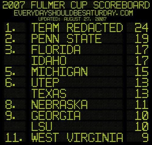 For speed's sake, we've dropped Penn State six points immediately, and really should be somewhere around Michigan's ranking and definitely below Florida. In true flubalicious fashion, Team Redacted yanks victory from the jaws of defeat, resulting in a stunning comeback for what appears to be a victory for Illinois in the 2007 Fulmer Cup. And as with most things [NAME REDACTED], it comes through no actual accomplishments of excellence of their own.
