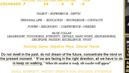 Yet Coach Dan Hawkins' blog is not only real--it will fucking change your life, brother. Because Dan Hawkins knows you're not living life to the fullest, and he's got the blinding html skills and excerpts from motivational handbooks and half-baked eastern philosophy texts to shoot gallons of metaphysical nitrous into those underperforming cylinders of yours, as evidenced by this awesome screenshot. Be the bow!
