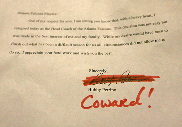 "Disloyal...cancer..." Lawyer Milloy crossed out the name "Bobby Petrino" on the farewell letter the coach left in Atlanta and inserted his own edit: