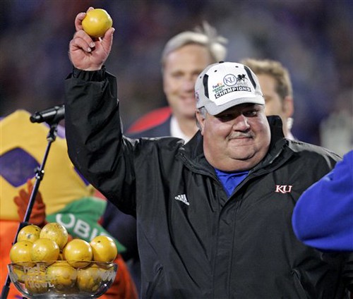 The Gatorade Defense. There will not be a fat joke here. There will not be a fat joke here. There will…aw, fuck it. There’s totally a fat joke here. They didn’t douse Mangino with Gatorade because he’d swell, because he’d absorb it all, because it would boil off his 214 degree body with visible steam, searing bystanders, they didn’t do it because he’d eat the jug…whatever. It’s a testament both to his control-freaky, no Mr. Nice Guy personality and to his preparation that Mangino actually had some assistant ready to block the Gatorade. Then again, to drag Kansas from football purgatory and into the Orange Bowl, being a controlling dick is most likely a prerequisite for the job.