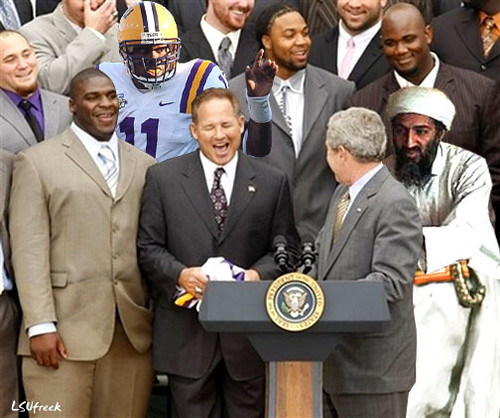 Bad intel again, dude, but it's 2008 and we're so past caring. Something positive did come of the whole circus, though: Ryan Perrilloux, terrorist hunter, did attend the ceremonies, and in fact caught Osama Bin Laden sneaking up to give George a thorough goosing.