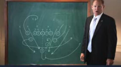 In this PSA for hurricane awareness, the camera comes in from a fade, as if you're blind drunk or asleep and BAM! Miles in your house, lecturing you about hurricane planning. (Louisiana joke here.) He then does some passable cue card work, but what caught our eye was the play drawn up on the board.