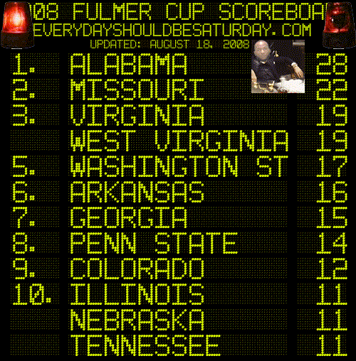 It's officially garbage time, leaving only two teams really in position to catch Alabama: West Virginia and Missouri. The viability of any team really exchanging places with Alabama is low, low, low: practice is in full swing, players are worked to the bone and under close supervision, and the math doesn't look promising. Only the promise of returning students, opening week parties, and a slightly weakened out-of-drinking-season tolerance to booze holds any hope of significant change. Kappa Delta rush party and Everclear Sidecars, you're our only hope!