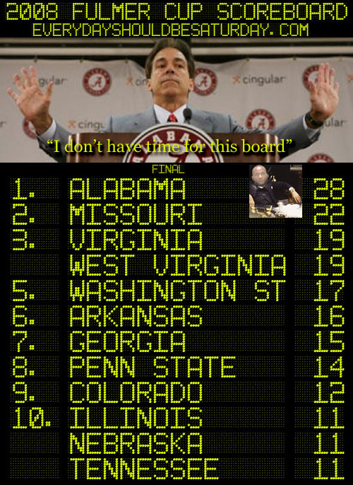 Thus concludes the Fulmer Cup 2008. Amen, alleluia, and hosannas all around. Special thanks to Brian, who remains hung like Reggie F'n Nelson, for the scoreboards, to Dave, who never neglected ot let us know of the smallest parking violation, and SAS Wiki, whose Fulmer Cup Accounting Station was an immense resource for someone as mathematically challenged as the editors of this site. You're all coming to extra-crispy hell with us.