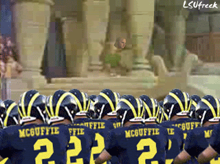 *1. Idolatry reversed; a Catholic inversion of an authoritarian meme where Michigan, symbolized by the dead, glowering paterfamilias of Schembechler, is rocked to its core by a radical Steve Reeves exercising his muscular authority in the name of destablizing the ancien regime. Notre Dame typically receives the feudal brand; here Freek inverts, slips an uninvited wet willie in the ear while you were busy.