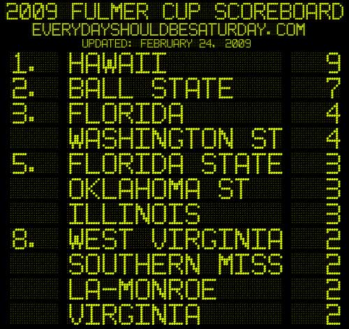Remember that Florida's points may go up--Carl Johnson's hearing has been moved on a continuance to April--and that Hawaii's score, unless assisted by another teammate, is solely the work of a single player, and would likely be discounted for the Ellis T. Jones III Award for Individual Achievement. It's February. We have a long, long way to go people.