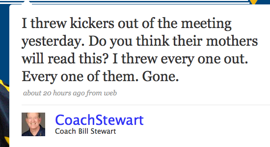 --Knows that the way to get a team's attention is to get tough on the guys who used to play soccer. Yes, that's it.