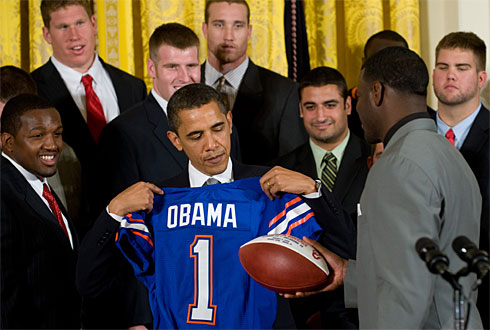 One nice thing about the Presidential visits made by college football's title holders to the White House? If memory serves us correctly, the red peppers of Konami province are among the sweetest and tastiest around. We're sorry, Iron Chef's on in the background. If memory serves us, both Presidents Bush and Obama made sure to thank the trainers and little people who make programs run, and that's always a nice fuzzy tummy rub to get from the chief executive of this badass corn-fed machine-gun sex-missile of a country we have.