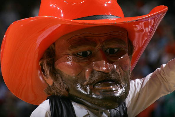 Category Two: Mascot: Oklahoma's Pistol Pete falls into the category of mascot only describable as "accidental grotesquerie." Is he going to awkwardly ask a young girl if she's had the menses yet? Did he hear tell of a mysterious half-cougar, half warlock creature that lived in the old abandoned mineshaft out yonder guarding a pile 'o Confederate gold, and is he going to tell you about it while staring at you just a bit too intensely? Is he second away from gunning your family down with a cold glint in his eye for no reason whatsoever? Didn't you last see his face bobbing down the street in a Spanish religious festival's procession that ended with dozens of spectators being burned alive by a collapsing bonfire?