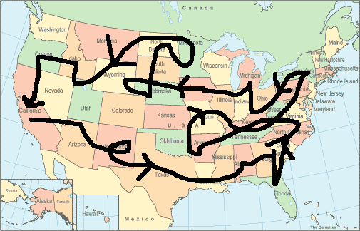Back to the action: our bearded hero, now in day 16 of his meth-gorged bender, has now taken the following route across the United States.
