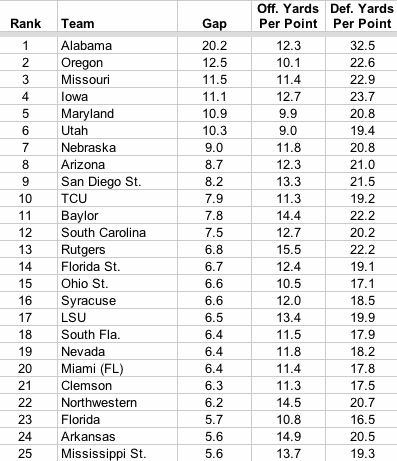 Almost double Oregon in Gap, Alabama's defense forces their opponents to travel nearly 3 times further to score a point than their offense requires. (Thank you, Mr. Addazio.)