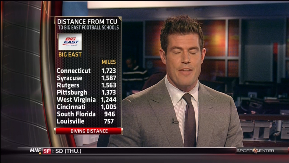 Maybe this isn't as funny as I think it is right now, but on College Football Live they listed the 'diving' distances from TCU to the Big East schools. Apparently Connecticut, the state containing the WWL's headquarters, is 1,723 miles straight down from Fort Worth, which by my estimates puts them somewhere between the third and fourth circles of hell (gluttony and greed).