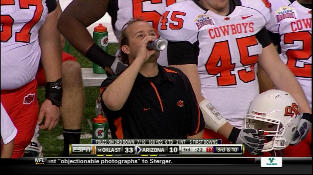 Yeah, it's his ninth of the night, but let's just keep this going until Dana Holgorsen can see the atoms of the opposing DBs' bodies quivering with quantum energy. Someone pointed out that Holgo the Barbarian was caught not only riding the bull on the sidelines, but caught downing a sugar-free Red Bull. Of course: how else does one fuel the fire without adding a few unsightly fuel tanks to a he-train of pure walking bandito sexhammer? If Holgorsen hadn't already been offered the West Virginia job-in-waiting, he could have just given the Mountaineers the url of the NCAA's offensive rankings and this picture, and gotten the job without saying a word.