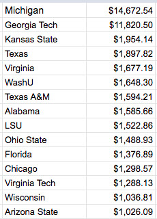 The top fifteen schools over a thousand dollars in donations are listed below.